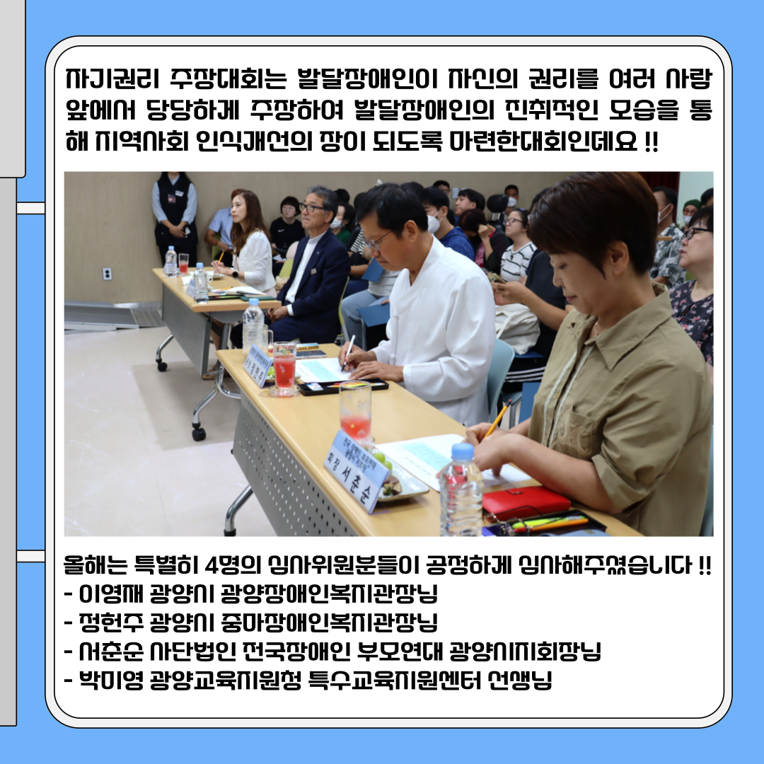 2024년 9월 9일 오후 1시, 광양시 광양장애인복지관 강당에서 ‘제2회 광양시 발달장애인 자기권리 주장대회’가 진행됐습니다 !